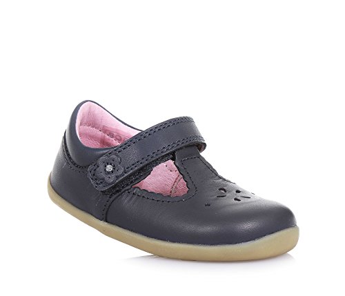 Bobux Step Up Girls T-bar shoes for first walkers, Bobux Step Up Reign, Bobux 726101. Navy blue leather. Bobux Step Up Reign T-bar Children's shoes are suitable for any little girl about to take her first steps. There is a soft and supple full leather upper with a cut out flower motif and gold inlay, as well as full leather lining, to help feet breathe. The lightweight, fully flexible TPR rubber sole makes it feel that they are walking barefoot. There is also a velcro strap to keep the shoes secure around the foot.